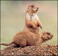 Communication is an integral part of the prairie dog's daily life. The animals are quite vocal and have a variety of shrill whistles and barks for different situations. During their above-ground activities, one or more of the animals are on sentry duty, sitting atop their mounds ready to sound a warning to the entire community. At the first sign of danger, the sentry makes a sharp, warning bark. The other prairie dogs race to their burrows, sit up, and join in with the warning cry to spread the word. If the situation warrants it, each family member, one by one, dives into the security of the burrow, leaving a deserted-looking town for the intruder. When danger is past, the sentry gives a songlike all-clear bark and the others again join in to spread the word. Another interesting vocalization is the territorial call. To make this call, the prairie dog thrusts its body upward full-length, points its nose in the air, and stretches out its forelegs. Since this is a quick, powerful movement, the first few times a young prairie dog attempts the territorial call, it often tumbles over backwards.