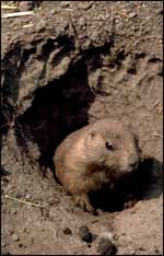 The burrowing owl was not hurt as badly by the extermination of so many prairie dogs as the ferret. The owls lost a few eggs and chicks to the resident prairie dogs, and the owls ate a few young prairie dogs. However, young prairie dogs were not the owl's main food, and it could dig its own burrow with its sharp talons and long legs. It just found the ready-made burrows less work than digging its own. Rattlesnakes were even less dependent on the prairie dogs for survival. The burrows were a cool place for the snakes to go to get out of the hot sun, and they also provided den sites, where rattlesnakes could gather and hibernate until spring. Of course, the snakes probably ate a share of the young prairie dogs and the burrowing owl chicks and eggs. Heat-sensitive facial pits made it possible for the rattlesnake to find its prey in even the darkest tunnel system. However, when the prairie dogs discovered a snake's presence, they escaped through the emergency exit, circled back to the hole where the snake entered, and, with the help of their prairie dog neighbors, filled in the hole, burying the snake alive. Other predators that include prairie dogs on their menu are eagles, hawks, coyotes, bobcats, and badgers.