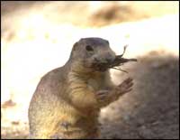The mother prairie dog takes grass down into the burrow to build a nest for the young, which are born in litters of four or five during March or April.