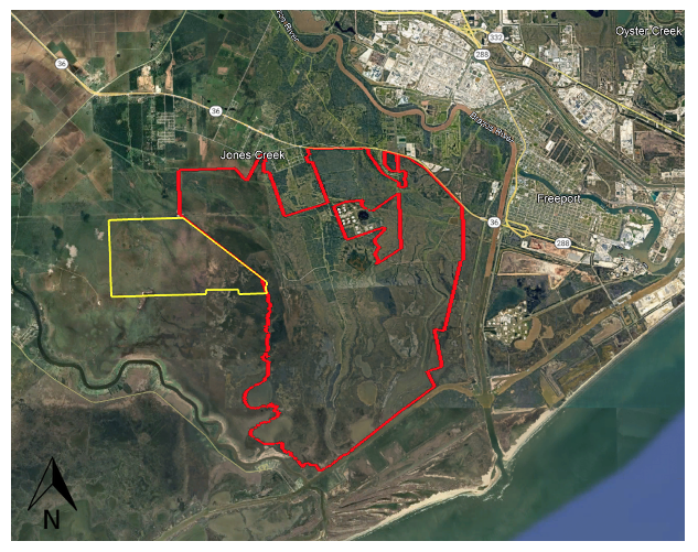 II. Discussion: The Justin Hurst WMA consists of 14,771 acres of coastal prairies, bottomland hardwoods, and marshes and serves as significant habitat for several resident and migratory species, including waterfowl and wading birds. It is bordered on the north by the Village of Jones Creek, on the east by Port of Freeport lands, and on the south by the Gulf Intracoastal Waterway.
