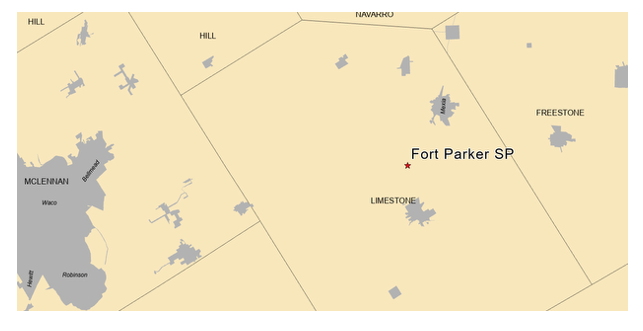 II. Discussion: Fort Parker State Park sits outside of the city of Mexia along the Navasota River in Limestone County, approximately 90 miles south of the Dallas-Fort Worth Metroplex. The park totals approximately 1,500 acres of land, which was donated by three local families, and was constructed by the Civilian Conservation Corps (CCC) in 1935. While the park was under construction, the CCC constructed a dam across the Navasota River, creating Fort Parker Lake, and built a replica of the original Fort Parker. The park opened in 1941 and currently provides recreational opportunities to the public like camping, fishing, hiking, nature viewing, and paddling.