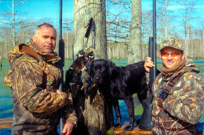 duck hunters in timber camo with dog and duck harvest