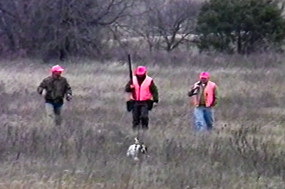 hunters in field with dog