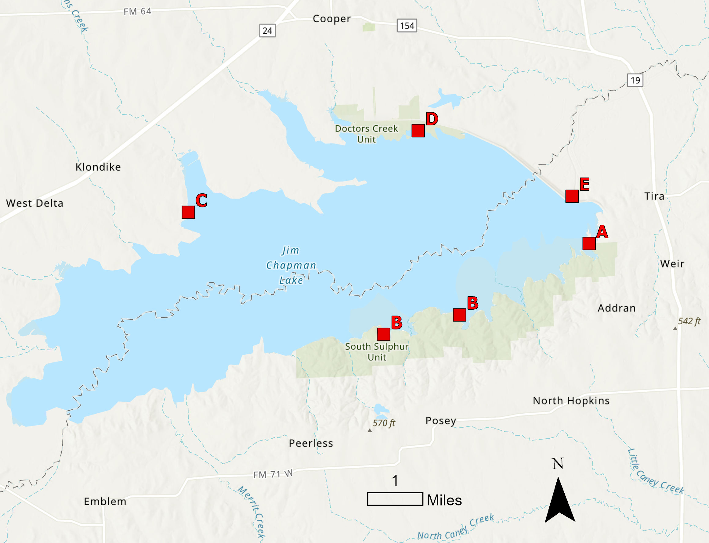 Cooper State Park is divided into two units, South Sulphur and Doctors Creek. The park offers campgrounds, shelters, cabins, beaches, picnic areas, boat ramps, two lighted fishing piers, fish-cleaning tables, and opportunities for shoreline fishing. Three additional public ramps are available. For details, see the chart below.