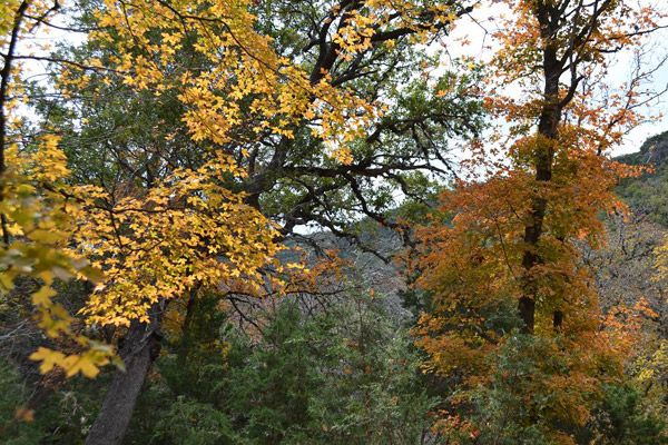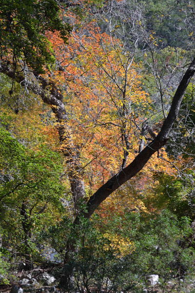 November 19, 2012 Report: We have come to the point that every time the wind blows, the leaves go to the ground. We still have some color but it is going fast. I see the Red Oaks and the Lacy Oaks starting to change. The drive along the Medina River, and the Sabinal River, has beautiful golden brown Sycamores, and copper colored Cypress trees, making the trip in this direction, extra beautiful. The Staff at Lost Maples appreciate your support in the form of the great amount of visitation we had the last two weeks. We are so grateful for the opportunity to share with each of you, this unique area of Texas. Come Back and see us again everyone.