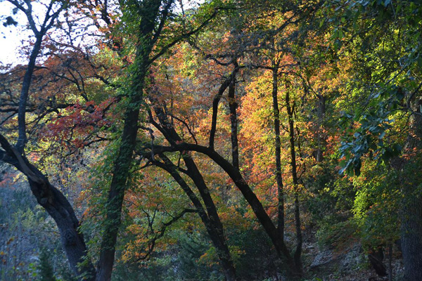 October 15, 2012 Report: The park and staff are prepared for fall colors, now Mother Nature needs to provide us with some cold weather. The park canvas is ready to be painted for all to see. There are a hand full of trees that want to change with just a minimal amount of leaves turning on the East Trail, and on the way to the pond. The leaves with color, on each tree, could be counted on both hands. This is a positive sign for Mother Nature to get to work. The park is in great shape just awaiting the icy touch of the season to make beautiful colors. The sunsets, and the dawn, are beautiful from the top of the west trail. Come see for yourself and experience the beauty of Lost Maples. The colors, when they come, are an added bonus.
