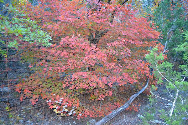 November 12, 2012 Report: Lost Maples has had some good colors but not as bright as in the past. Last year with the drought the trees produced no seeds, this year we have a bumper crop of maple seeds. The colors are there, but not as bright as in the past because of the seed production. We have trees with leaves that are still green, or that have not completely turned. The weather has not been cold enough for some of the trees, but that is changed now with this cold front. The next couple of nights should get the trees to finish their fall color change and next weekend should have some really good color on the remaining trees.
