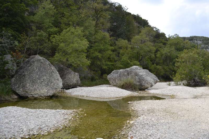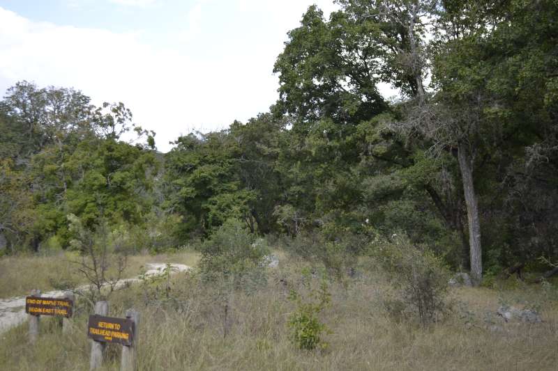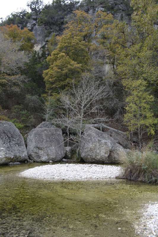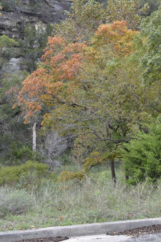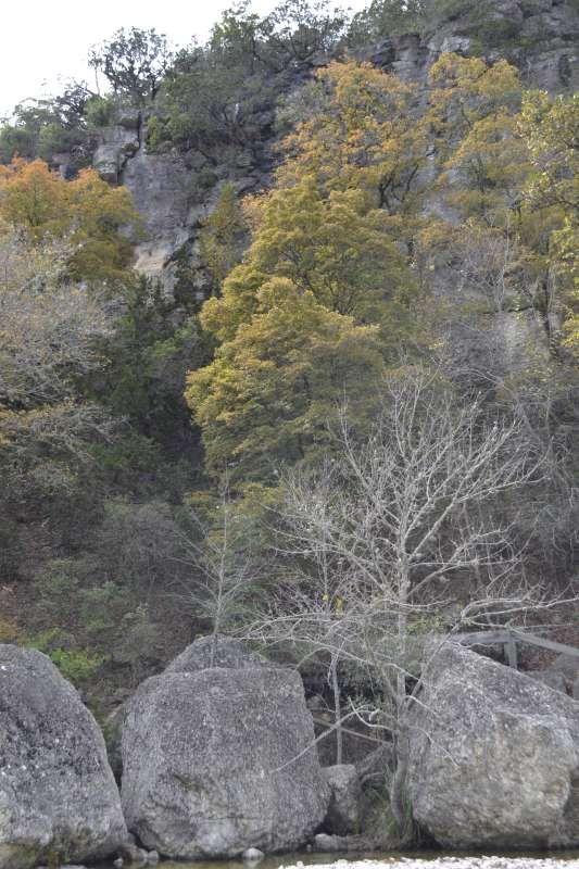 Nov. 17, 2015: The weather has not helped the foliage color change this year. The color in the park is minimal now, with only a few trees starting to show pinks, yellows and orange, and just a handful starting to change color. At the turn to the Overflow Parking Area, the tree we call Old Faithful is starting to show red colors but the majority of trees on the trails have lost most of their leaves, and with a weather front coming, more leaves will likely be lost. Along the road to the park there are still some trees with green leaves that might give us some color but with or without the fall maple color, this park is still one of the most unique and beautiful in the state. Come visit and enjoy the beauty of Lost Maples State Natural Area.