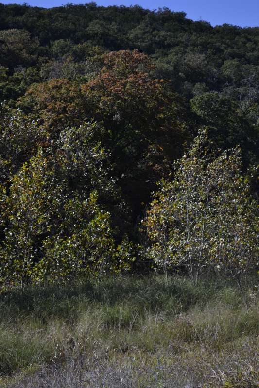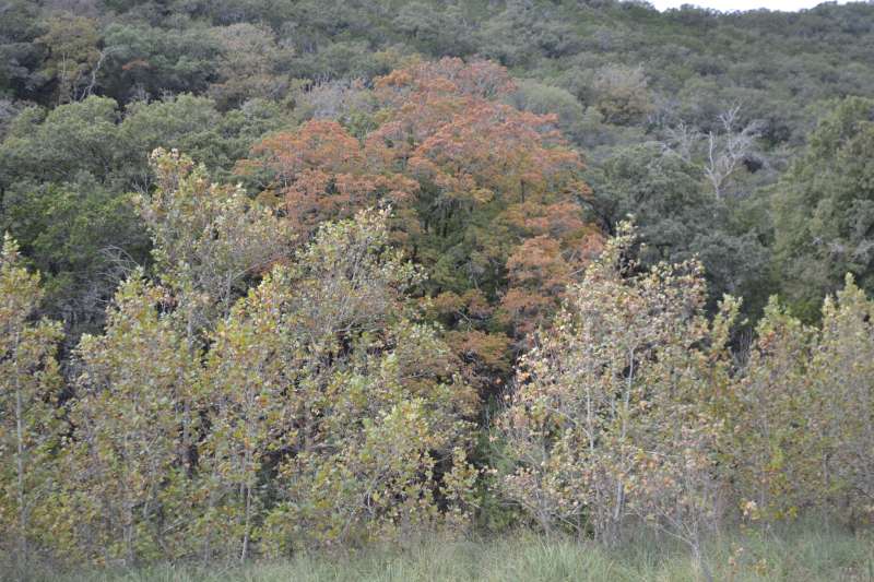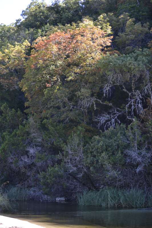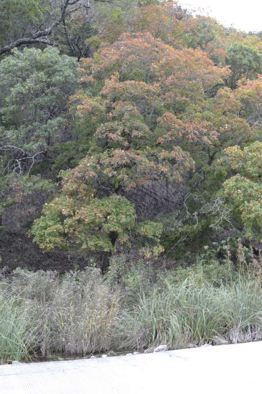 Nov. 10, 2015: We are well into November and have had too much rain and no cold nights to get the leaves changing color. The colors that we do see are light pink, yellow, faded orange and brown, but the leaves remaining on the trees are mostly yellow with brown and they are falling off. It is our opinion that the red colors normally seen this time of year will be on small, young trees only. There are two small trees in the Day Use Area showing some red color. This may not be one of the better years for leaf color but the park is always beautiful. The best color today is along the park road entering Lost Maples, where some trees have a little red tint and some have yellow with orange. The staff at Lost Maples appreciates your support and hope that you come visit us at this wonderful park. The drive out here is great and the Cypress trees along the rivers have turned a beautiful rust red.