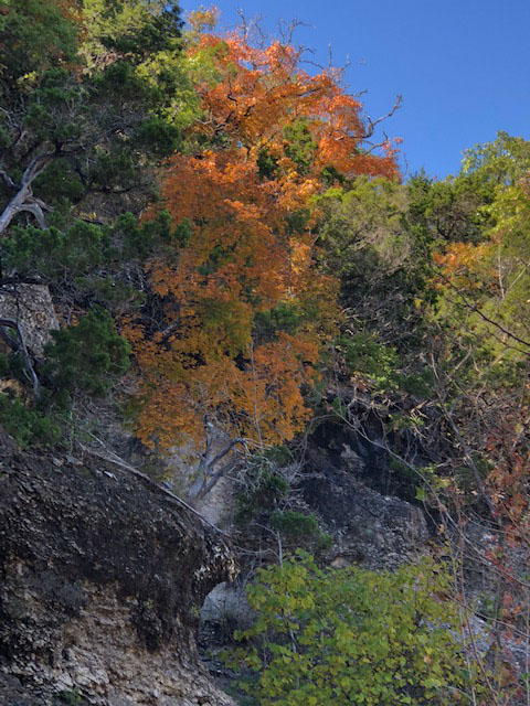 Oct. 27, 2018 Park Foliage Photo (photo of mostly green leaves and a maple tree with mostly orange leaves)