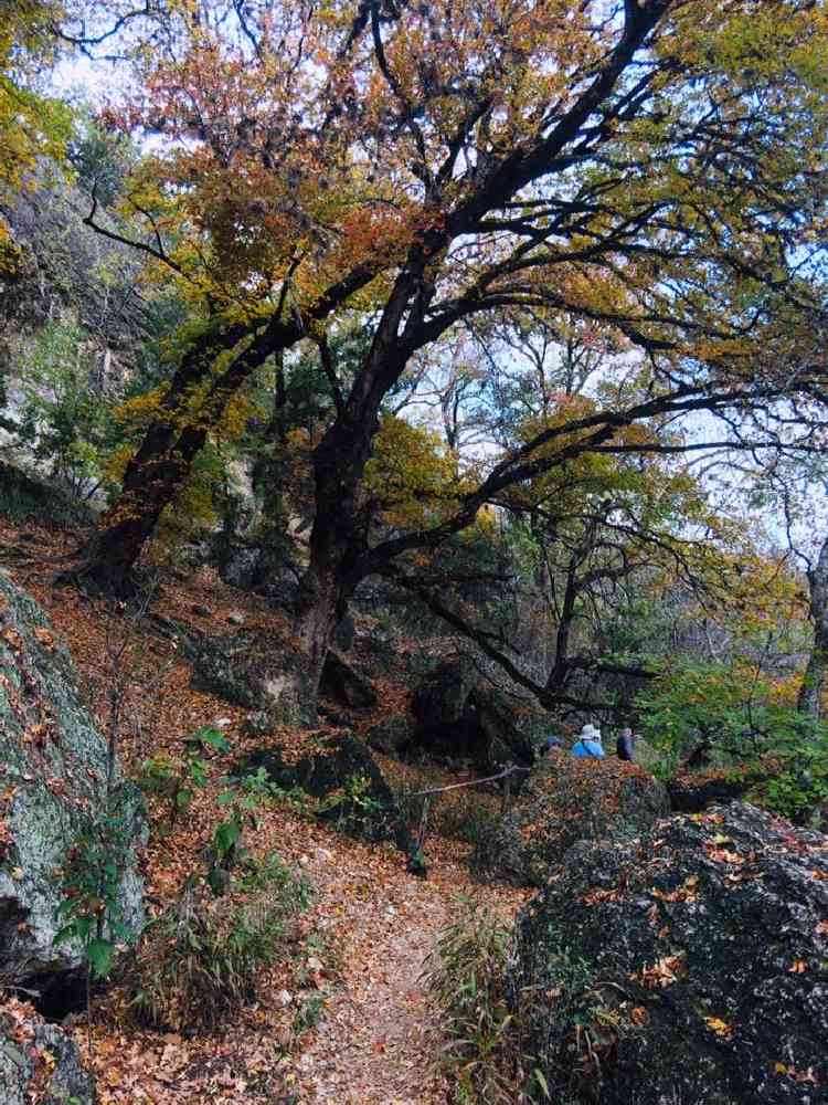 Nov. 7, 2018 Park Foliage Photo (trees with different colored leaves and colored leaves on the ground)
