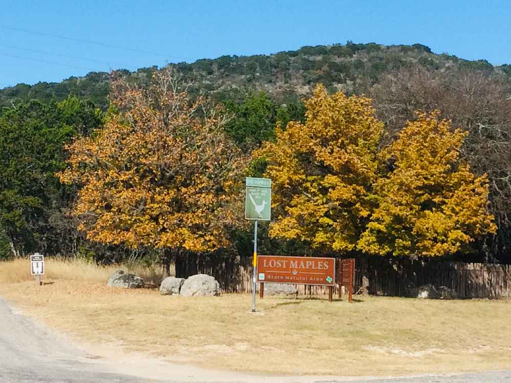 Nov. 21, 2018 Park Foliage Photo (2 maple trees with mostly yellow-orange leaves next to the entrance sign)