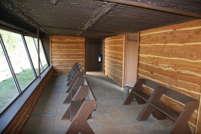 Our bird blind has a 100-foot asphalt trail approach with an asphalt base inside. Parking is available in a grassy area a few yards from the trail. The blind is open-air with a roof, and has a 35-foot glass viewing wall. The viewing area has a bath/dripper, feeders maintained daily all year. Hummingbird feeders are up in the spring/summer. You may see other wildlife here as well.