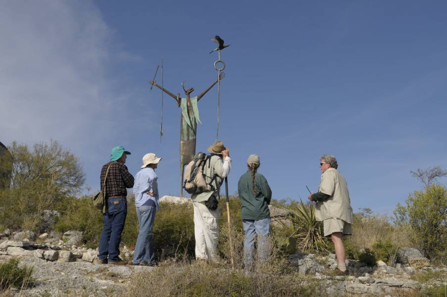 Hikers Around Shaman Sculpture